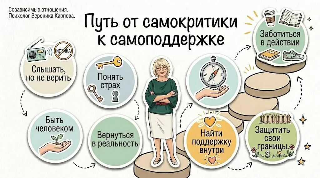 Трансформация от самокритики к самоподдержке — это путь к обретению внутренней свободы, где не осталось места зависимости от мнения окружающих. Пройдя этот путь, можно выстроить отношения с собой на основе уважения и заботы, что является ключом к психологическому благополучию.