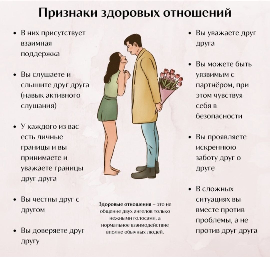 - Non-negotiable: Уважение к вашим границам, способность к извинениям, надёжность и умение конструктивно решать конфликты.