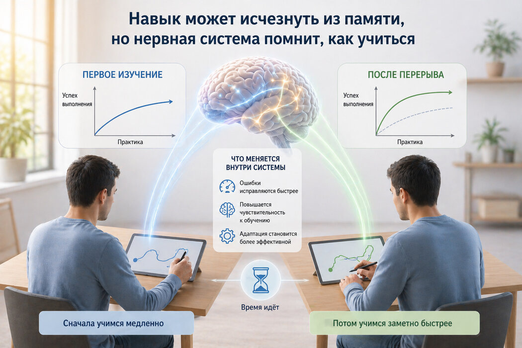 Стандартное объяснение гласило, что мозг просто запоминает опыт, позволяя человеку учиться быстрее при повторном обучении. Однако новая работа утверждает, что ускоренное повторное обучение может происходить даже в отсутствие четкой памяти о предыдущем навыке. Исследователи пришли к выводу, что изменения в нервной системе после первого обучения помогают адаптироваться и учиться быстрее без необходимости вспомнить конкретные действия.
