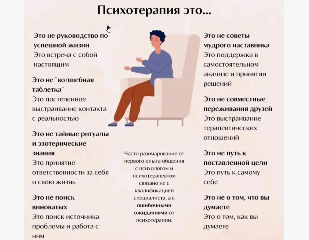 По сути, психотерапия не является тренировкой для достижения идеального «Я». Это пространство для встречи с собой, где можно исследовать свои состояния: грусть, радость, замешательство и многие другие. Терапия не требует превращения в кого-то другого; она помогает углубиться в осознание своей истинной природы.
